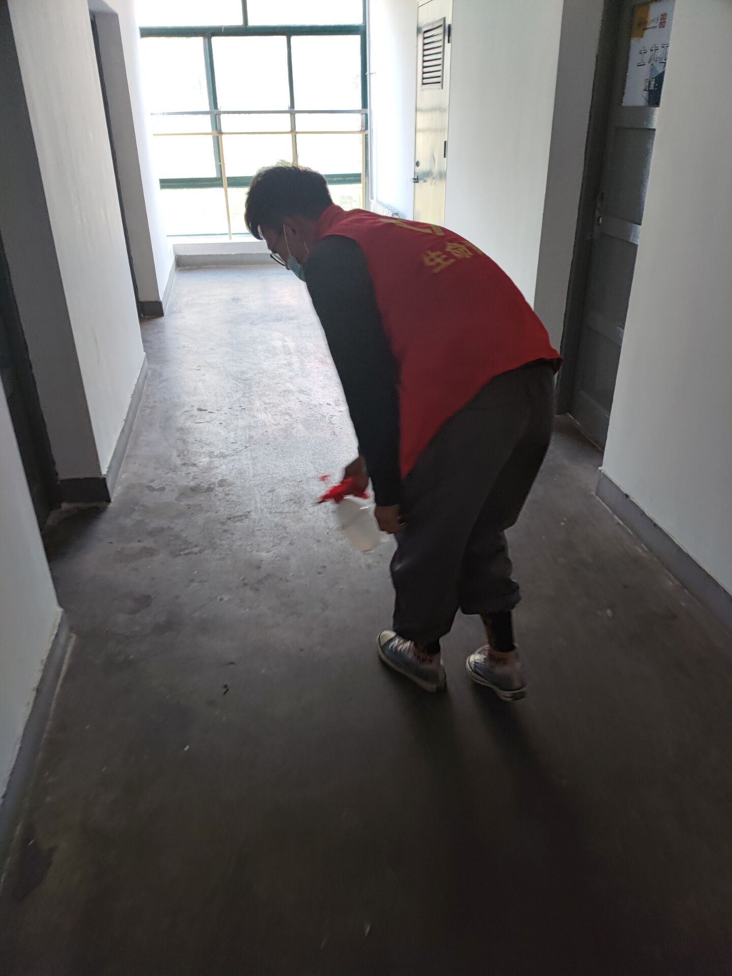 生命学子在宿舍楼道做消毒工作