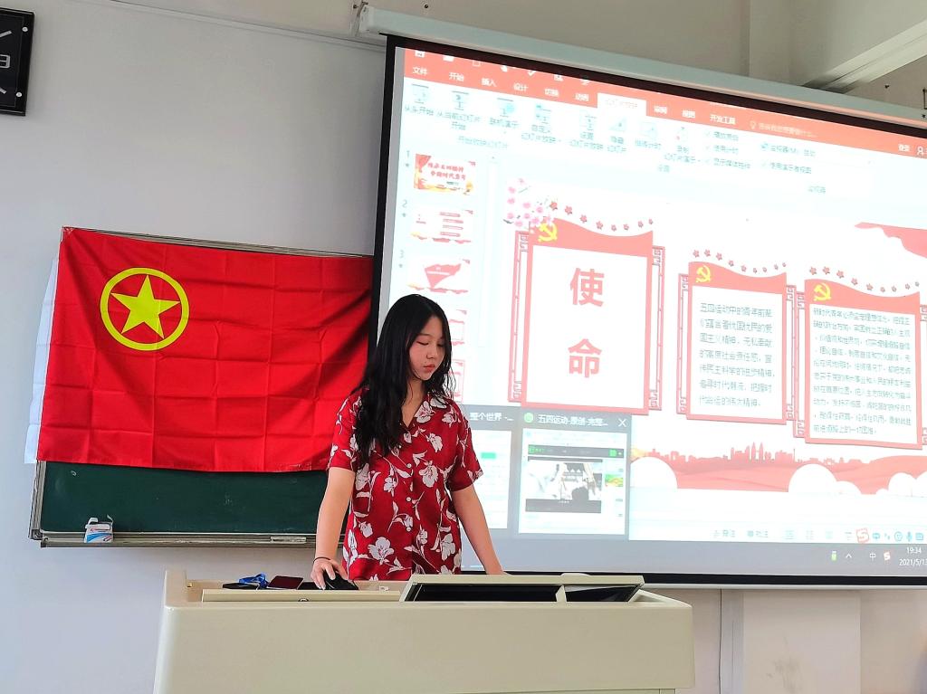 活动开始,食品班团支书冯佩瑶介绍了中国共青团组织并就五四运动、五四精神发表讲话,号召时代新青年跟团走,学习五四青年精神,发扬五四青年精神,凝心聚力、牢记使命。然后,由组织委员张金霞带领员工们重温入团誓词,回忆入团光辉时刻,同学们劲握拳头,语调激昂,大声宣誓,将光荣且振奋人心的入团一幕再现,优秀团员刘婷和孔欣凯为我们分享张一悟等优秀青年的红色故事。最后,团支书冯佩瑶总结此次主题团日活动,鼓励员工们成为一名爱党、严守纪律、努力拼搏的优秀共青团员。