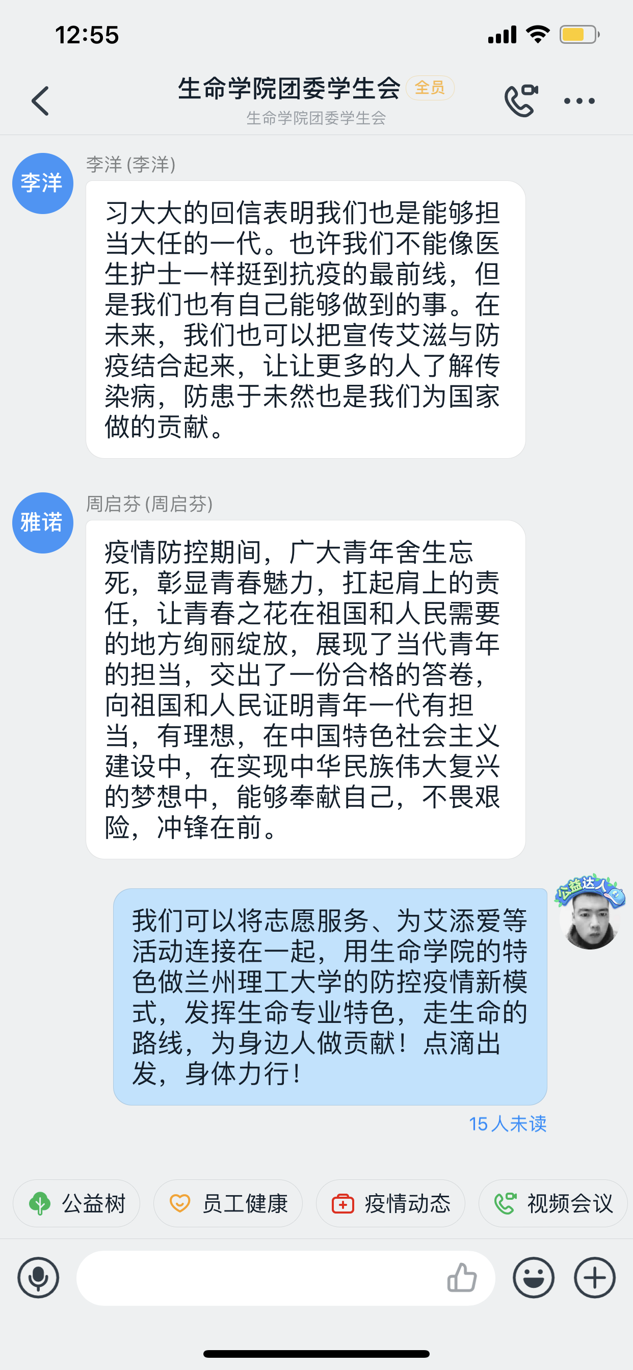 本次《习近平总书记给北大援鄂医疗队全体“90后”党员重要回信》主题学习,是一次卓有成效的教育活动,所有人都感触颇深,积极参与讨论,表达自己的学习感想。正如习近平总书记的回信中写道:“广大青年用行动证明,新时代的中国青年是好样的,是堪当大任的!”作为时代新人,我们没有经历战火纷飞的年代,但我们同样能够在国家大难面前勇担重任,在国家将未来托付于我们身上时,不退缩,不惧怕,不气馁,努力完善自身,提升自我,我们愿以吾辈之青春,护卫这盛世之中华。
