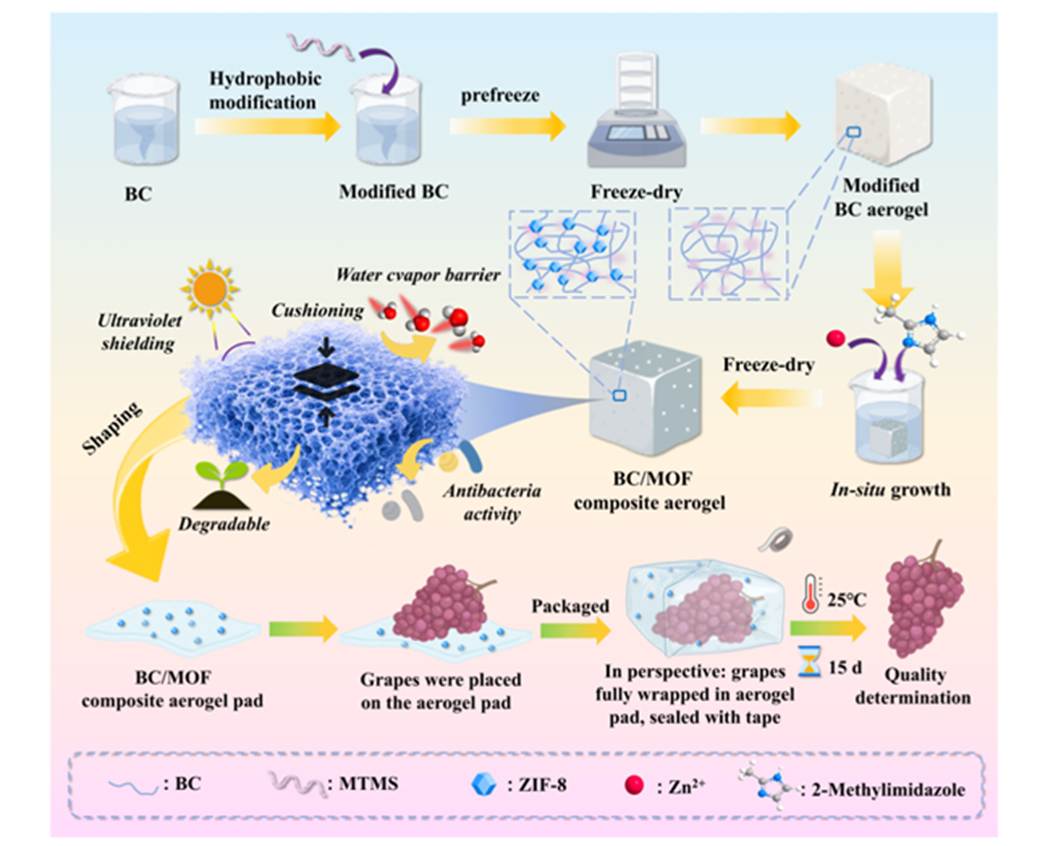 在国际知名期刊Food Control(中科院一区Top期刊,IF=6.3)发表重要研究成果Directional design of BC/MOF composite aerogel with simultaneous physical protection and antibacterial function for grape postharvest preservation”(DOI: 10.1016/j.foodcont.2026.111995)。2024级硕士研究生杜嘉仪为第一作者,任海伟教授和杨伟霞副教授为共同通讯作者。该成果立足绿色可降解材料与功能化包装的交叉领域,以生物质基细菌纤维素气凝胶为载体,借助原位生长技术精准负载MOF功能组分,定向开发出一种可用于葡萄等水果保鲜的集机械缓冲、抗菌与生物降解于一体的BC/MOF复合气凝胶包装材料。