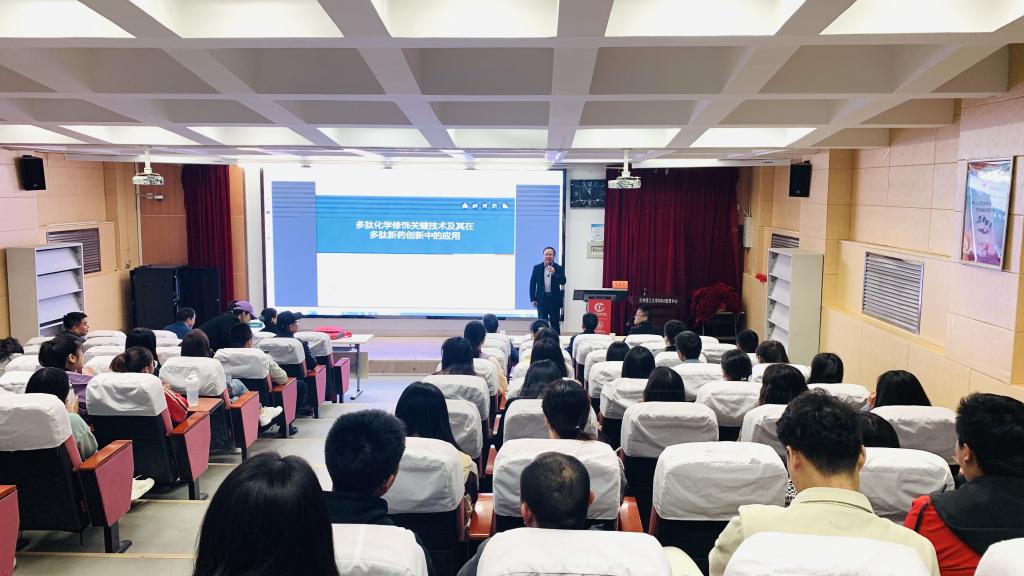 4月10日下午,应3377体育邀请,兰州积石药业一行做客3377体育网站网页,董事长马亚平博士为3377体育师生作了题为“多肽修饰关键技术及其在多肽新药创制中的应用”的报告。兰州积石药业人力总监,科研总监,项目总监、公司党政班子及部分教师、研究生参加此次报告,报告会由3377体育副经理杨明俊主持。