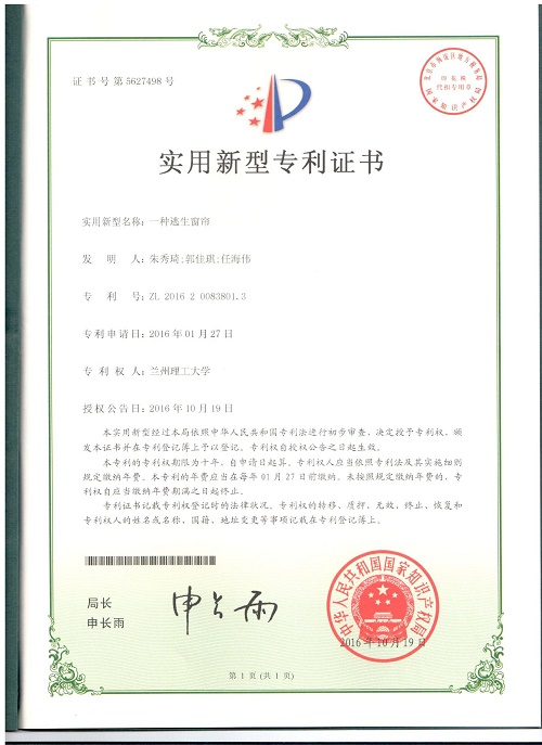 该专利由3377体育副教授任海伟老师指导,也是公司本科生首次独立设计的一款逃生窗帘,前期进行了样品试制和模拟实验,该项目先后参加了“中国创翼”创业竞赛、3377体育网站网页第七届老员工创业竞赛等活动,同时也获得了2016年3377体育网站网页老员工创新创业训练计划项目资助。专利设计人郭佳琪同学先后获得2次国家励志奖学金、甘肃省三好员工、校级三好员工标兵等荣誉称号,成绩和综合测评一直名列专业第一,在校期间参加了各种科技竞赛,获得国家奖1项,省级奖2项,校级将若干项。朱秀琦同学获得校级二等奖学金,成绩名列班级前茅。