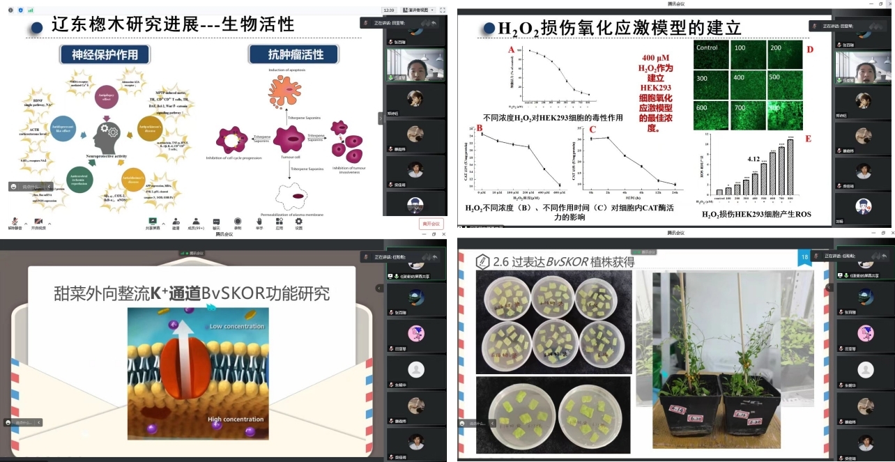 张百刚老师首先介绍了两位报告人的基本情况、学术成绩和研究方向。田亚琴博士的报告主要对东北地区特有的一种食药兼用型小乔木-辽东楤木,从营养成分、化学成分、细胞抗氧化活性和自由基清除能力四个方面系统对比了不同产地辽东楤木果实的差异,为天然抗氧化剂原料的获得提供了新思路。任盼盼同学介绍了基因鉴定、生信分析、表达模式分析、表达载体构建、转基因植株获得等方面的知识,并以“钾通道”为例分享自己读研以来从接手课题、阅读文献、搭建研究框架到着手实验的研究过程,包括实验中可能遇到的一些问题及应对方法。与会师生和两位报告人进行了积极的互动,就实验过程中碰到的问题及各自采取的解决办法、未来研究方向进行了热烈的交流。
