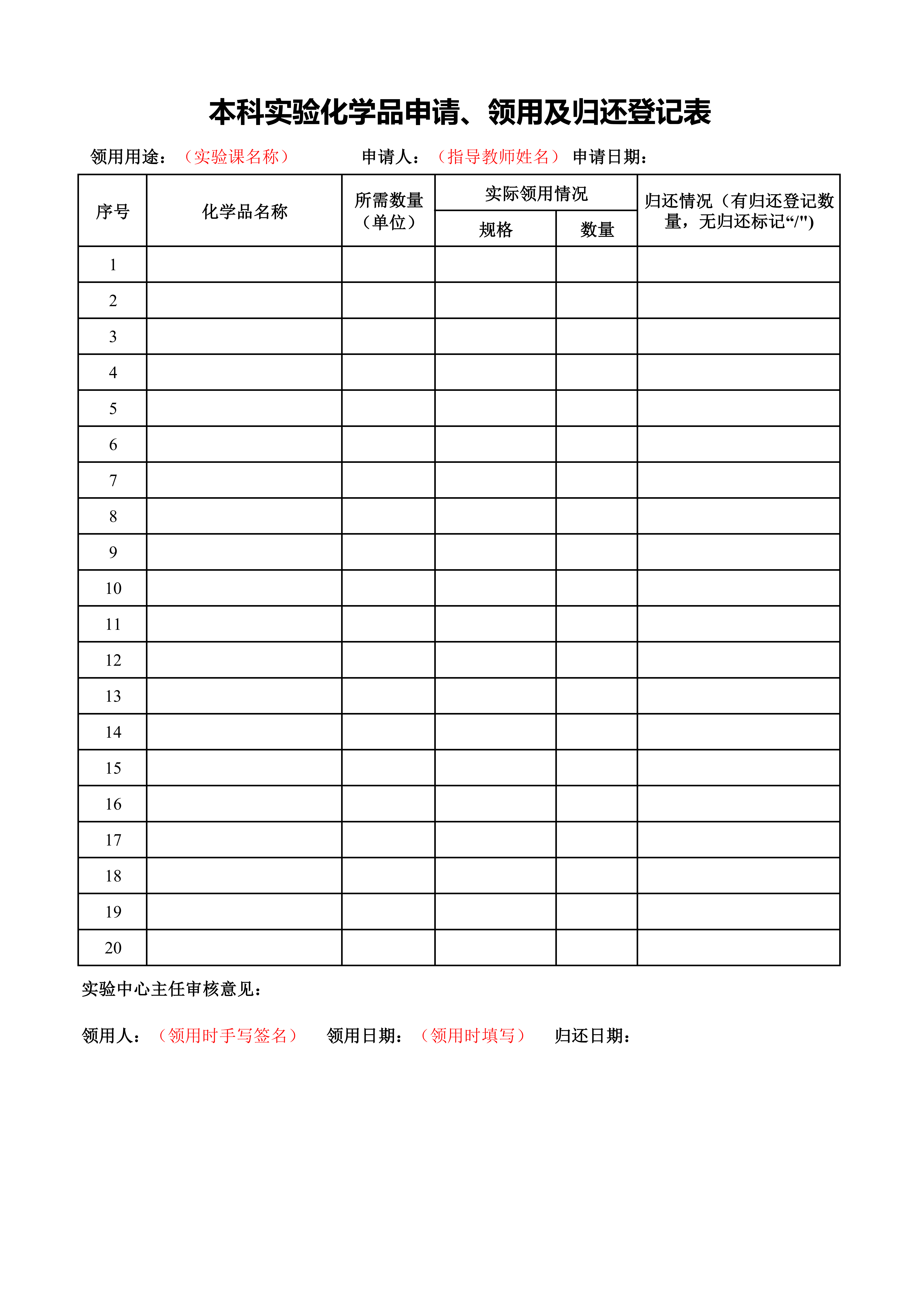 本科实验化学品申请、领用及归还登记表